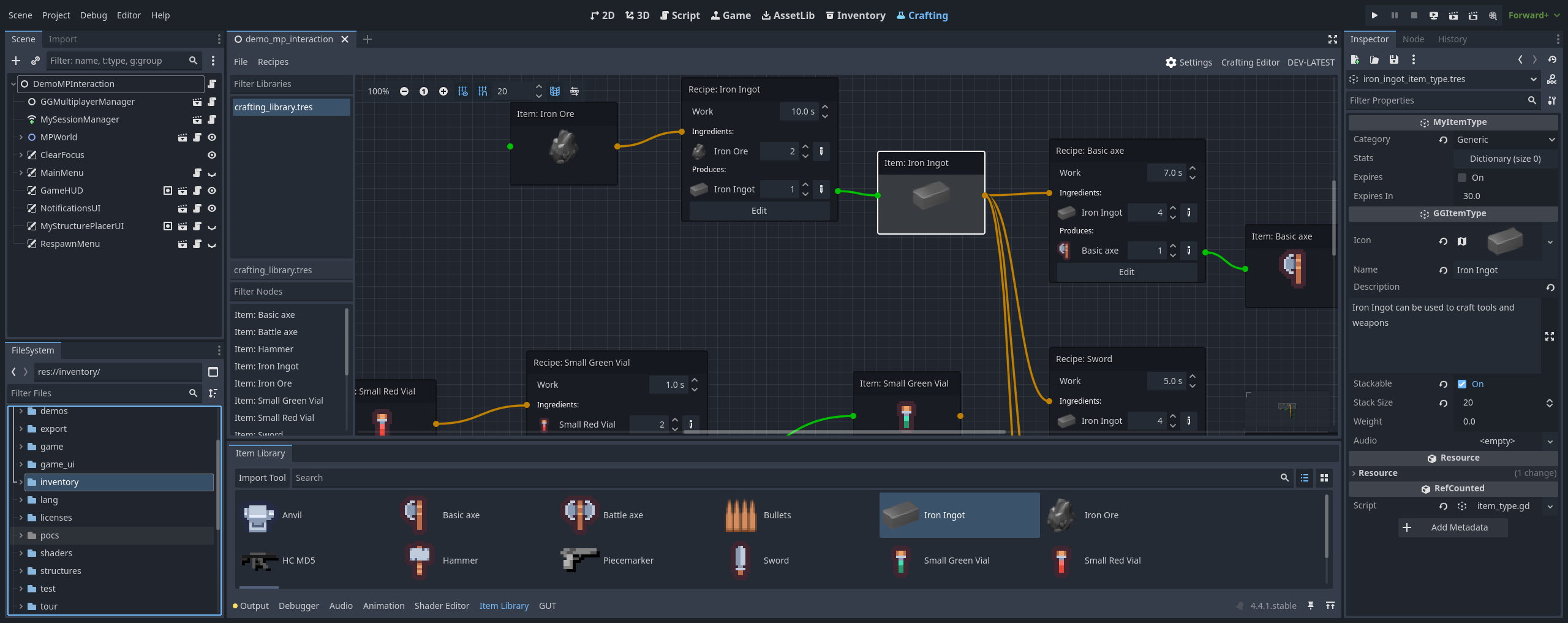 Crafting is built on top of the item management provided by the inventory system. The basic premise is that the player can combine items to create new ones. It's a bit like cooking or baking, so it borrows some of its terminology: To craft, you need recipes that require ingredients and result in some kind of output.